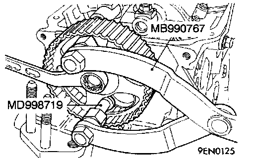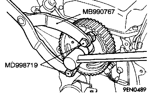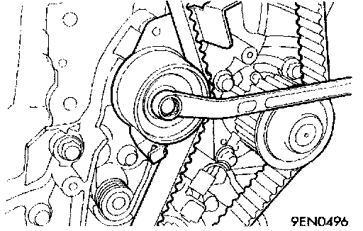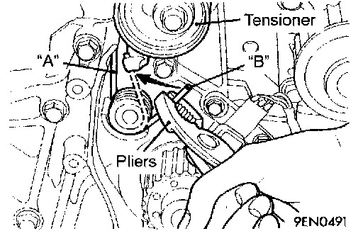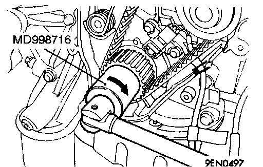 CAUTION: This procedure utilizes the camshaft's driving torque to apply tension evenly to the timing belt. Be sure to turn the crankshaft as described above. Do not turn the crankshaft counterclockwise.
