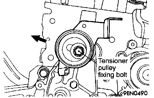 5. Slightly loosen the timing belt tensioner bolt to tension the belt by a force of the tensioner spring.