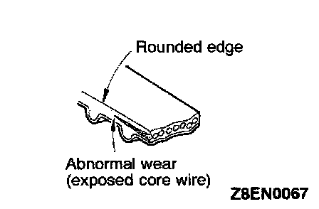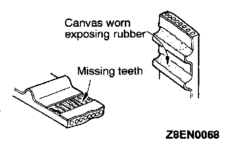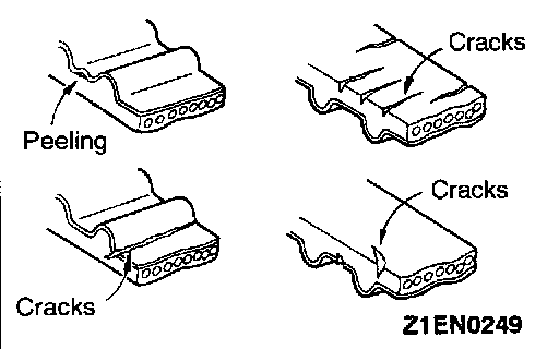 Check the timing belt closely. Replace the belt with a new one if any of the following defects are evident: