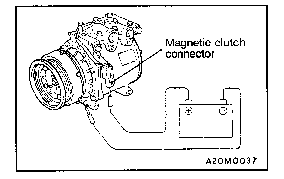 Connect the battery (+) terminal to the compressor side terminal, and ground the battery (-) terminal to the body of the compressor. The condition is normal if the sound of the magnetic clutch (click) can be heard.