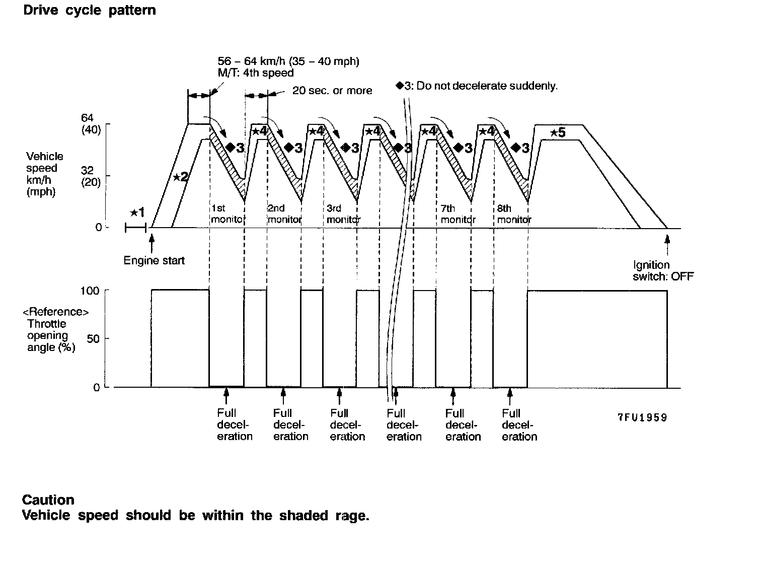 *4: Accelerate to 56 - 64 km/h (35 - 40 mph), and continue driving for 20 seconds. (After 1st monitor (deceleration), wait for 20 seconds or more until the next monitor (deceleration) starts). Then repeat <>3 and *4 steps eight times