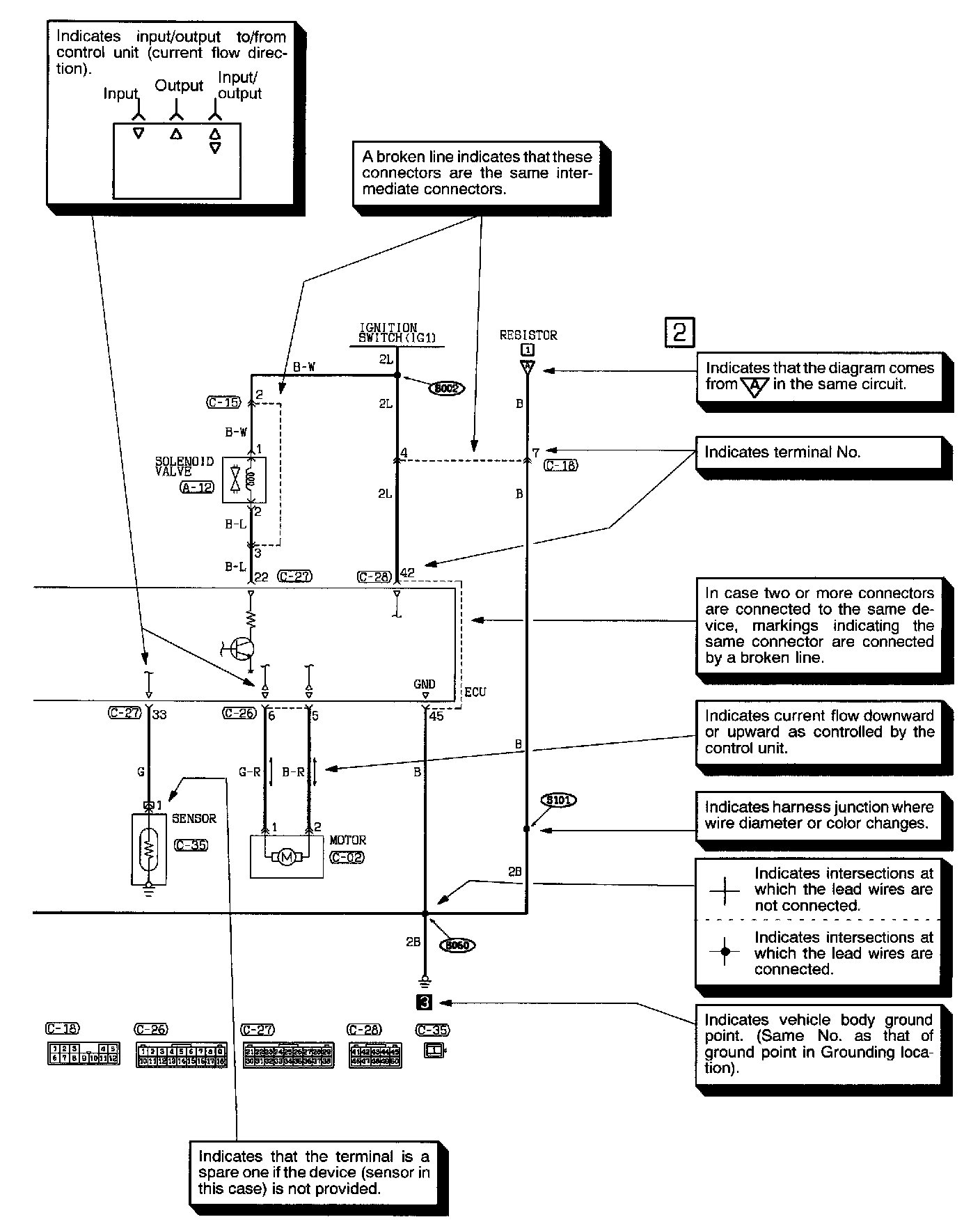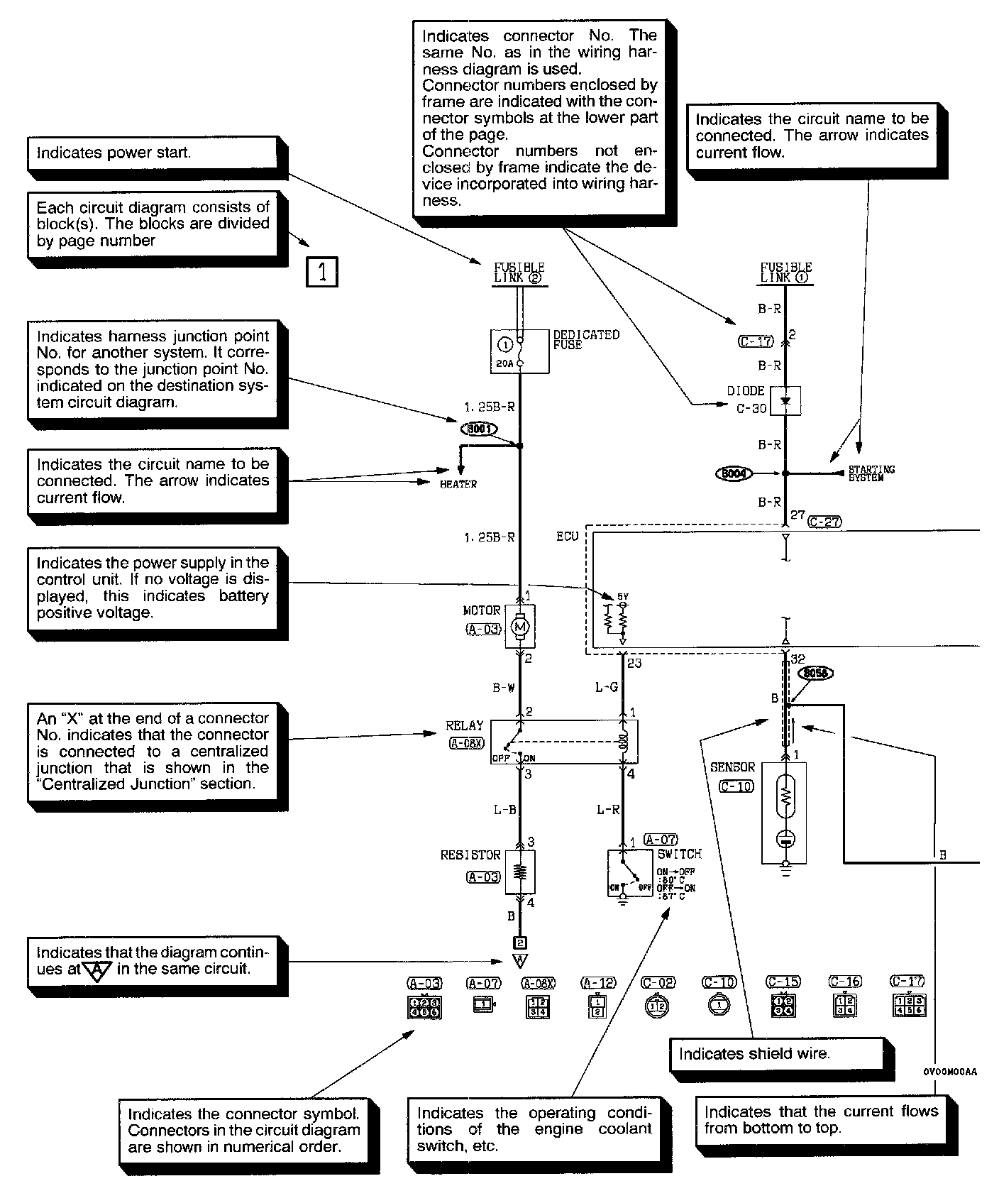 The Circuit of each system is shown from the fuse (or fusible link) to ground. The power supply is shown at the top and the ground at bottom to help understand of how the current flows.