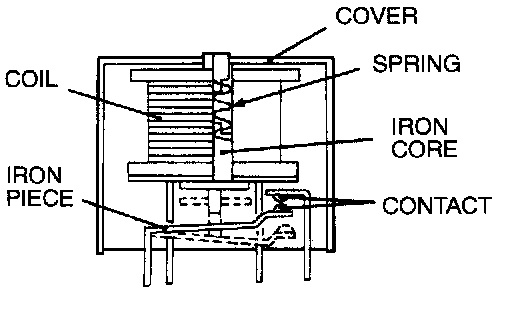 1. When current flows through the coil of a relay, its core is magnetized to attract the iron piece, closing (ON) the contact at the tip of the iron piece. When the coil current is turned off, the iron piece returns to its original position by a spring, opening the contact (OFF).
