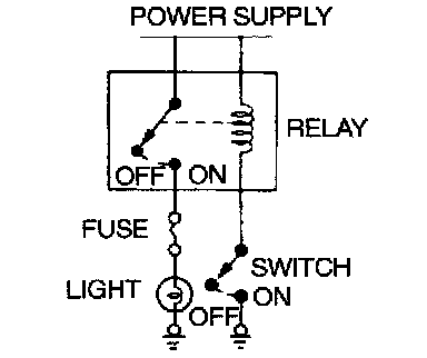 2. By using a relay, a heavy current can be turned on and off by a switch using much less current. For example, in the circuit shown here, when the switch is turned on (closed), current flows to the coil of the relay. Then, its contact is turned on (closed) and the light comes on. The current flowing through the switch is much less than that for the light.