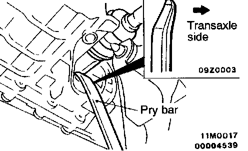 1. Insert a pry bar between the transaxle case and the drive shaft as shown to remove the drive shaft.