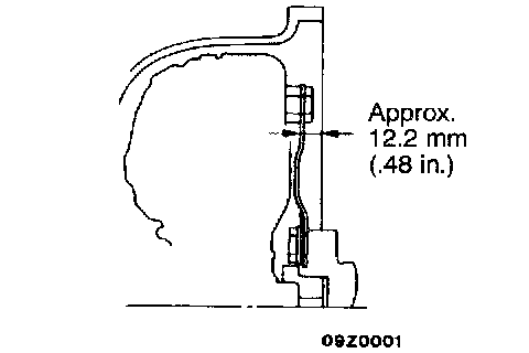 After securely inserting the torque converter into the transaxle side so that the shown dimension is approximately 12.2 mm (0.48 inch), install the transaxle assembly to the engine.