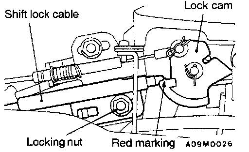 4. Tighten the locking nut so that the end of the shift lock cable comes above the red marking of the lock cam.