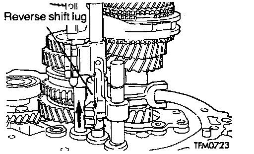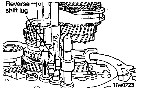 1. While sliding the reverse shift lug in the direction shown, remove the 5th speed shift fork, 5th speed shift rail, reverse shift lug, snap ring, steel ball and reverse interlock rail.