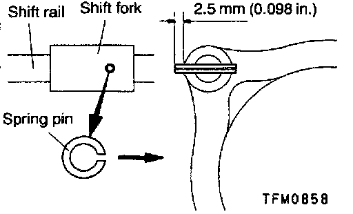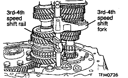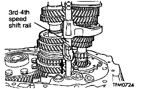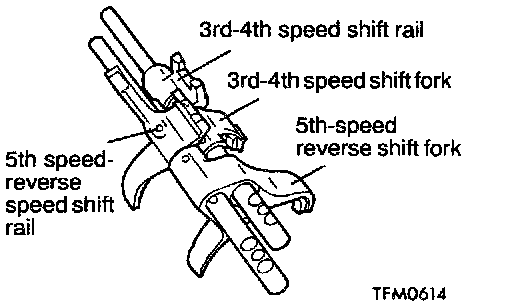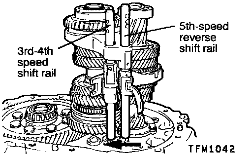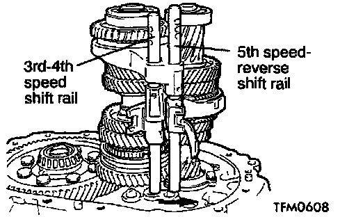 2. Install the 3rd-4th speed shift rail and fork and the 5th speed-reverse shift rail and fork.