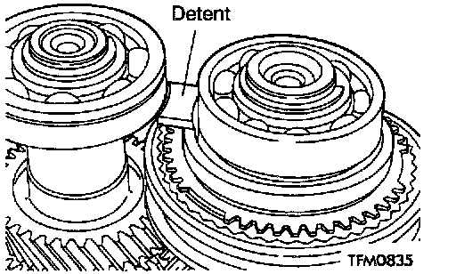 While placing the reverse brake cone detent in the position shown, install the input and output shafts together.