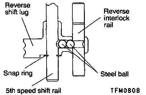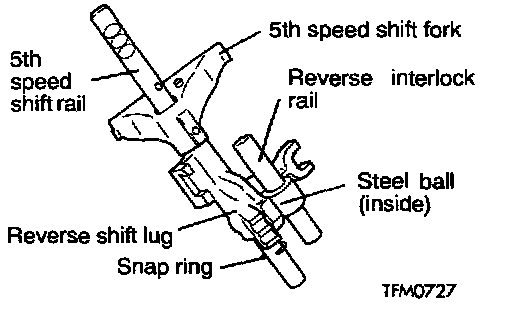 2. Install the reverse interlock rail, steel ball, 5th speed shift rail, 5th speed shift fork, reverse shift lug and snap ring in the illustrated positions.