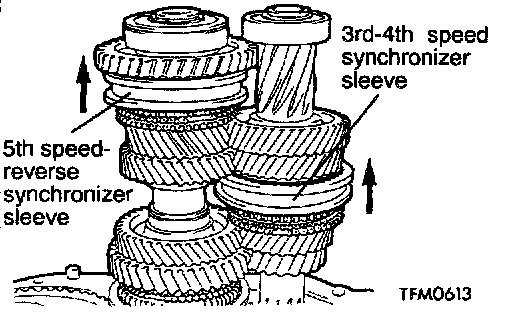 1. Shift the 3rd-4th speed synchronizer sleeve and 5th speed-reverse synchronizer sleeve in the direction shown.