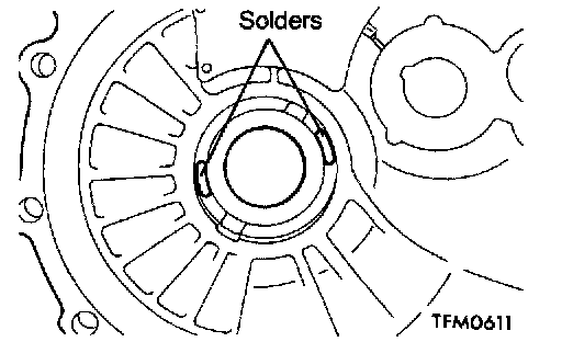1. Put solders [about 10 mm (0.39 inch) long, 1.6 mm (0.063 inch) in diameter] in the illustrated positions of the transaxle case and install the bearing outer race and differential.