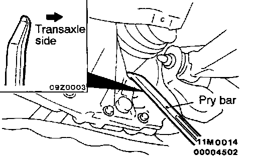 1. Insert a pry bar between the transaxle case and the drive shaft as shown to remove the drive shaft.