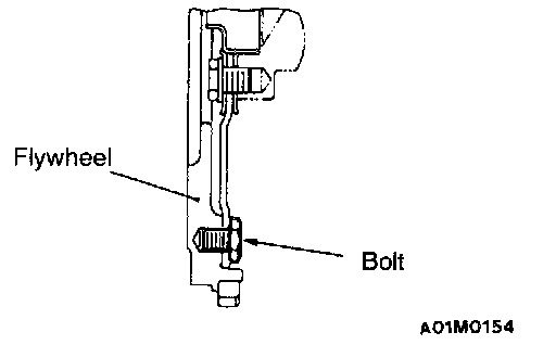 CAUTION: Do not remove the flywheel mounting bolt shown by the arrow. If this bolt is removed, the flywheel will become out of balance and damaged.