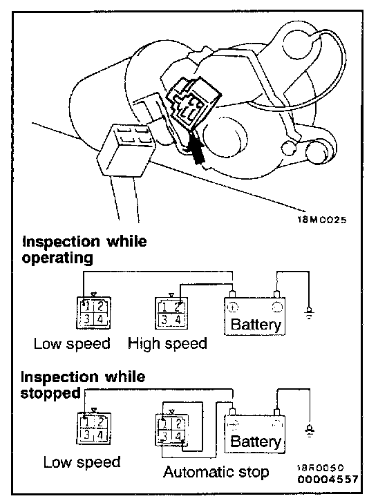 Connect a battery to the wiper motor as shown in the illustration and inspect motor operation at low speed and high speed.