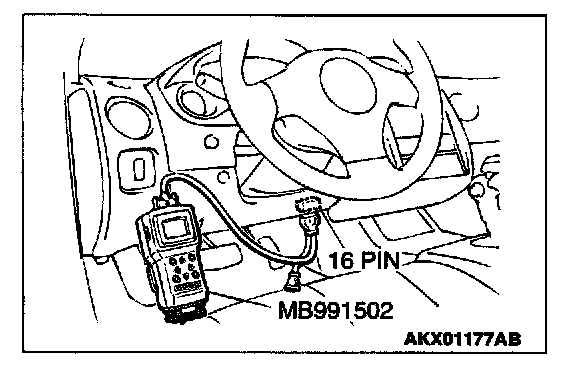 CAUTION: To prevent damage to scan tool MB991502, always turn the ignition switch to the "LOCK" (OFF) position before connecting or disconnecting scan tool M5991502.