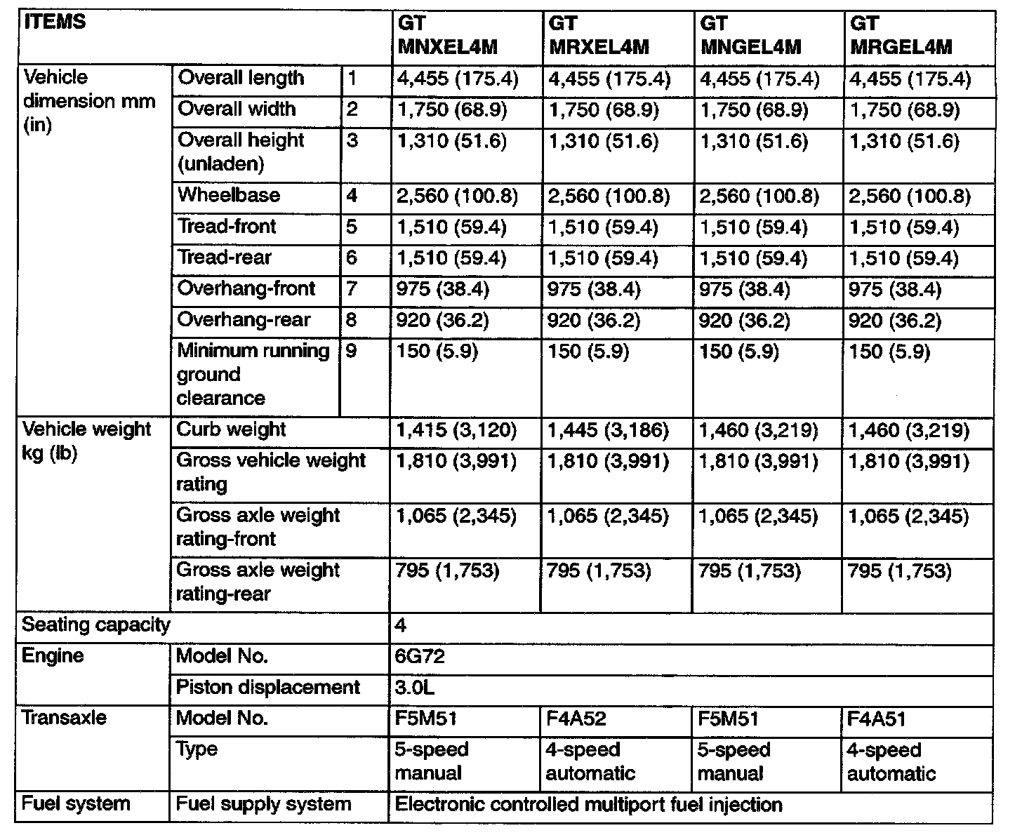 General Specifications (Model With 3.0L Engine):