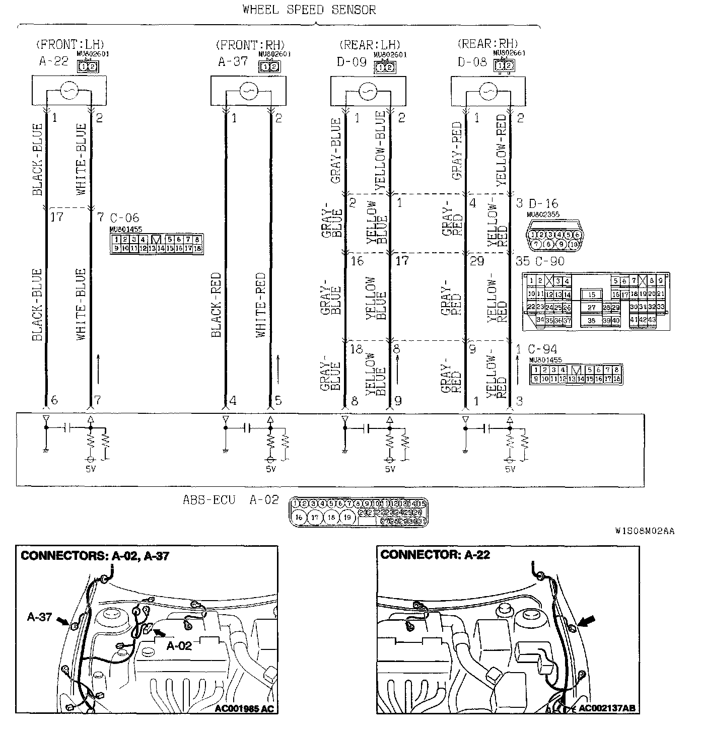 STEP 5. Check the harness wires between the ABS-ECU connector A-02 and the wheel speed sensor connectors D-08