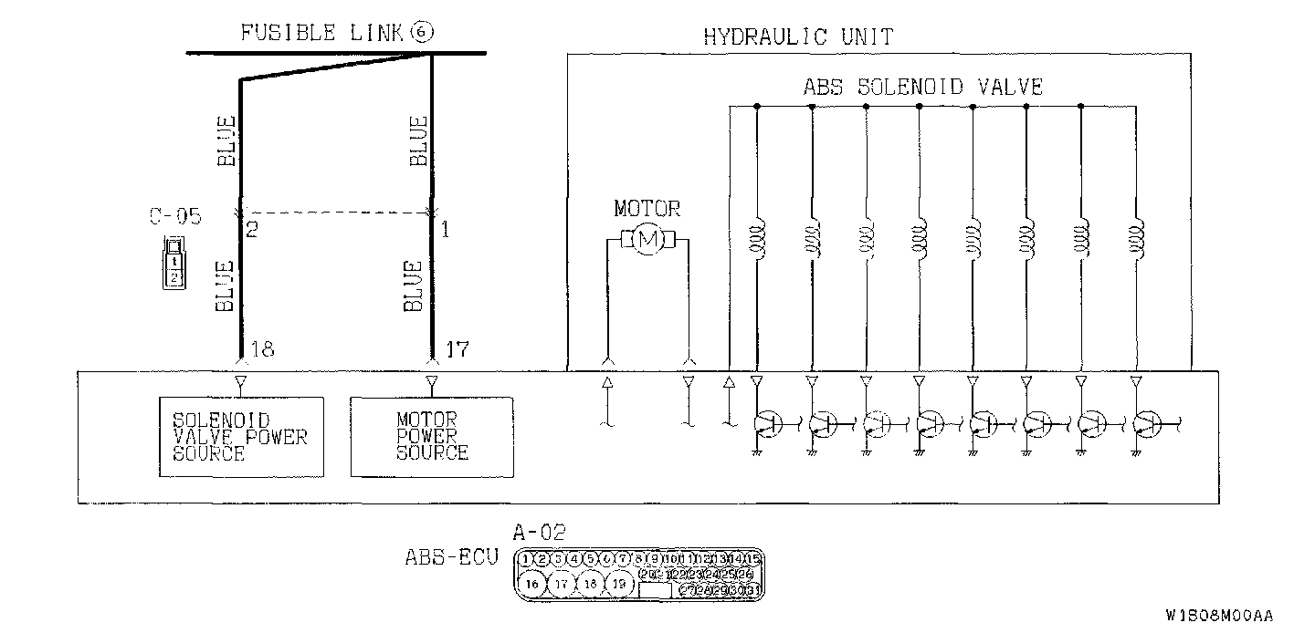 Power is continuously supplied to the ABS-ECU through fusible link number 6 to operate the solenoid valves and motor. The ABS-ECU supplies power to the solenoids. If controls each solenoid by switching the ground circuit ON or OFF, depending on driving conditions.