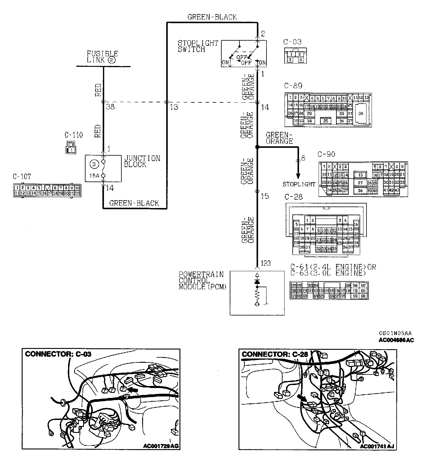 STEP 7. Check harness for damage between stoplight switch connector C-03 terminal 1 and PCM connector C-61 <2.4L Engine> or C-63 <3.0L Engine> terminal 123.