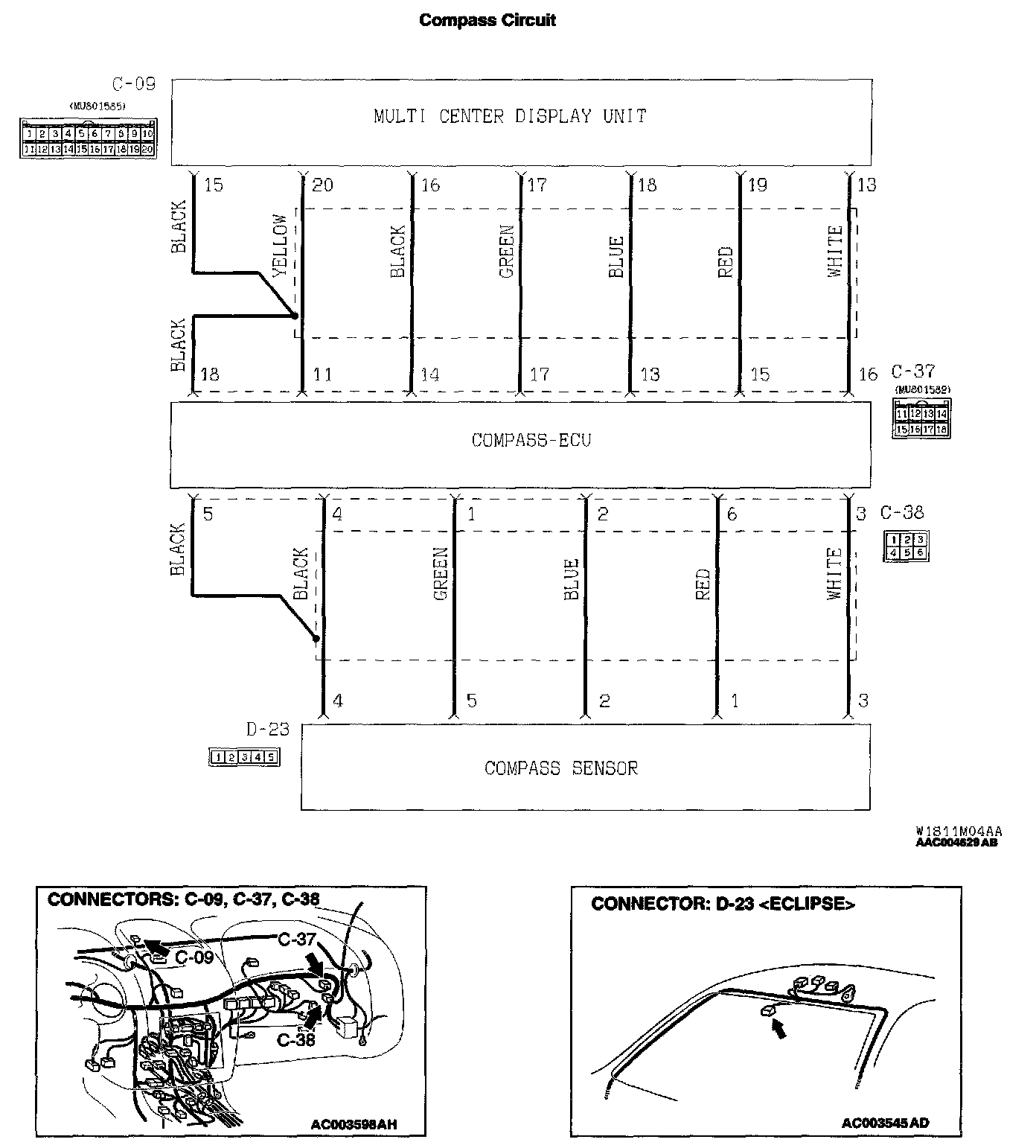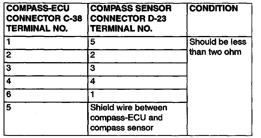 1. Do not disconnect the compass sensor connector D-23 and compass-ECU connector C-38, measure at the harness side.
