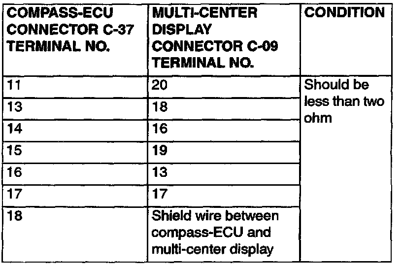 1. Do not disconnect the compass-ECU connector C-37 and multi-center display connector C-09, measure at the harness side.
