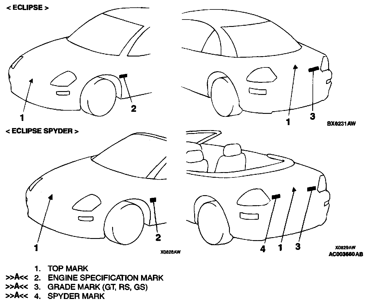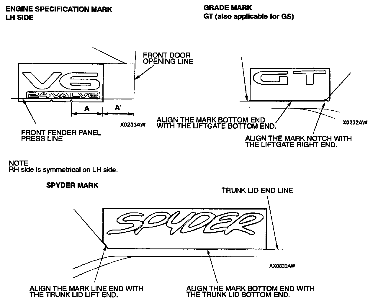 3. Make sure that air bubbles are not trapped in the application surface. When applying the mark, use special tool MB990528 to press the mark from its center to top and bottom gradually.