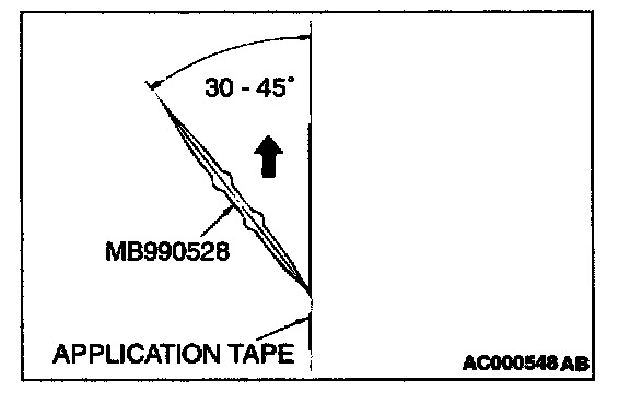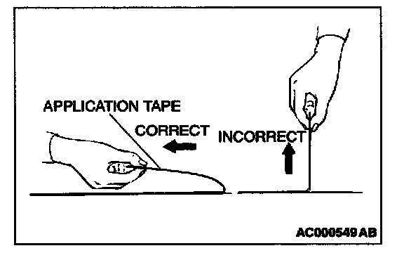 4. Peel off an application tape (top protection paper) horizontally and carefully from one end. If an air bubble is left in the mark, open a hole by using a needle, and then use special tool MB990528 to expel the air bubble.