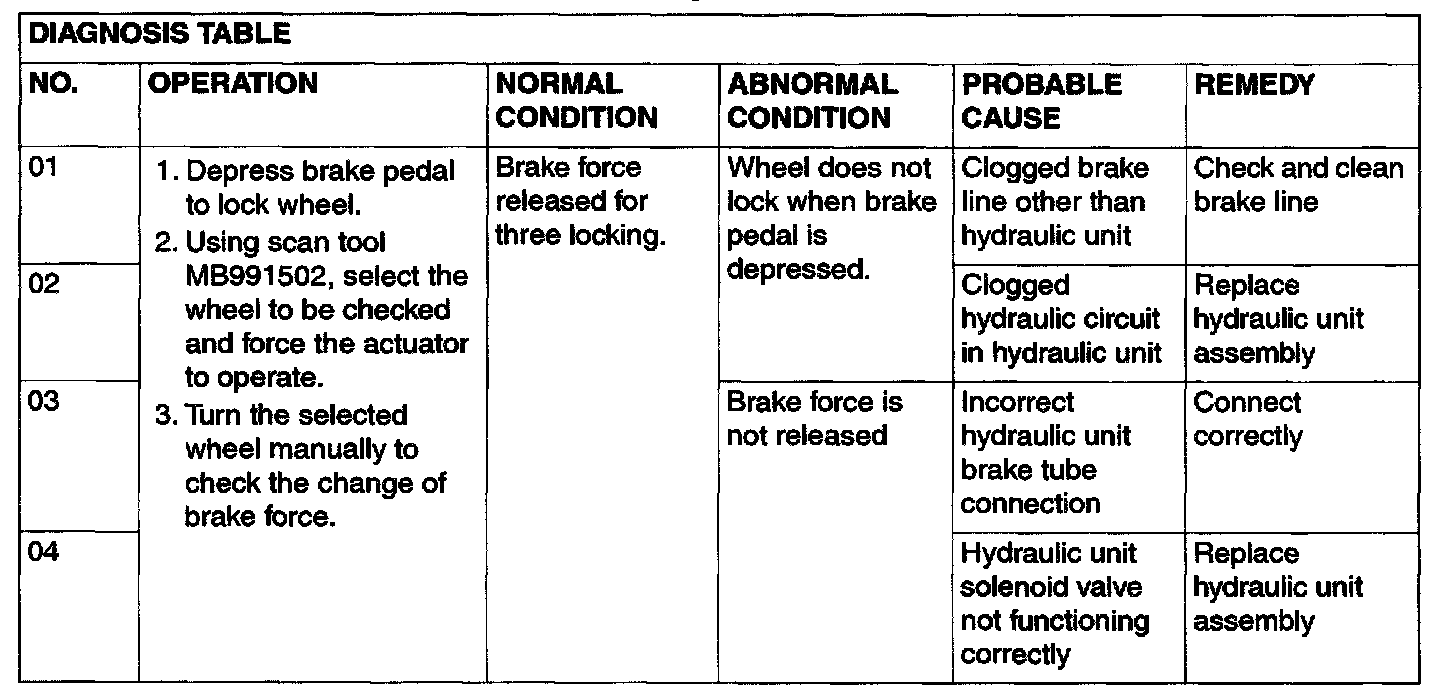 - When the ABS has been interrupted by the fail-safe function, scan tool MB991502 actuator testing cannot be used.