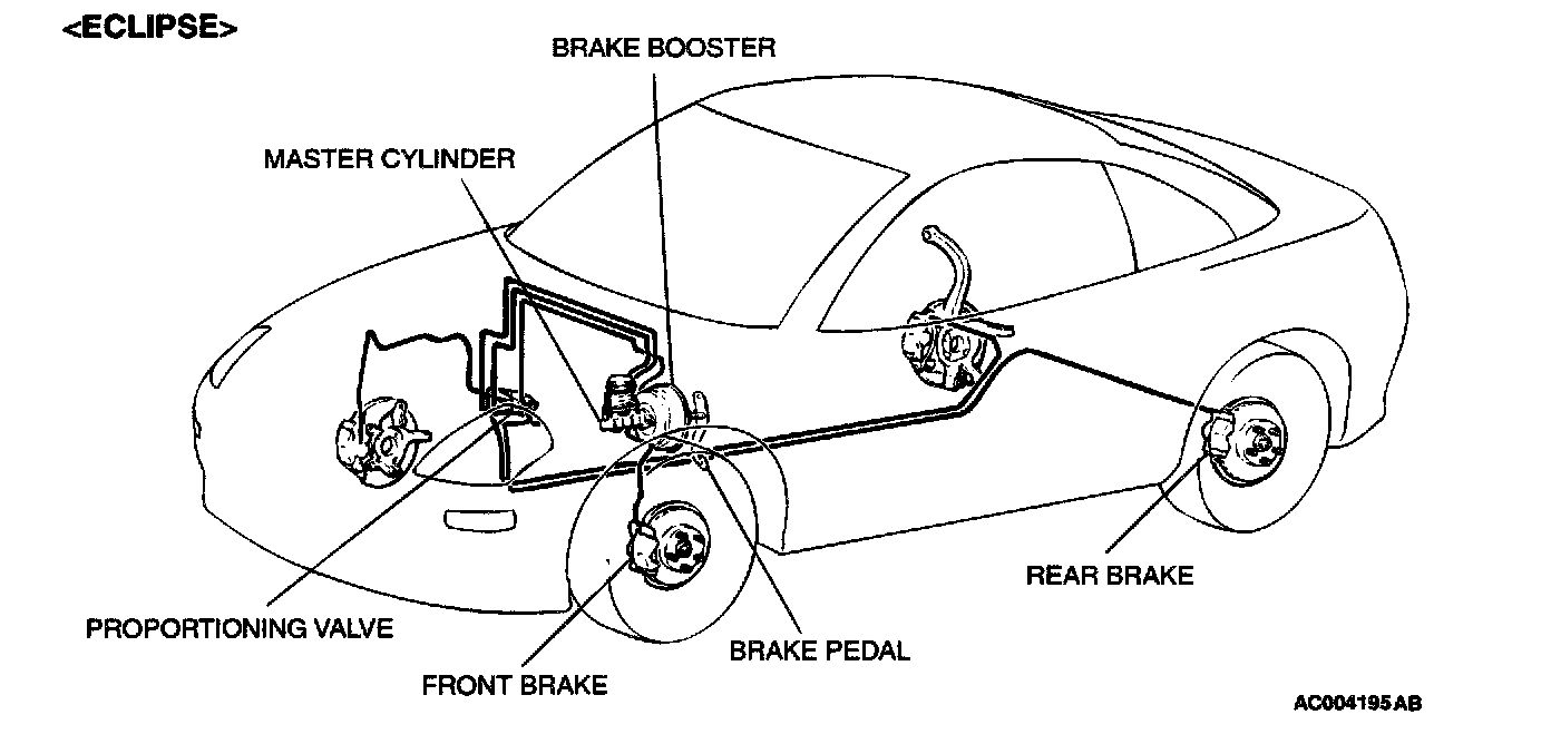 GENERAL DESCRIPTIONThe basic brake system uses a X-type hydraulic feed arrangement. The left front and right rear brakes operate together from the same circuit, right front and left rear operate likewise. If a leak develops in the left front line or piston, the right rear brake would be affected. For safety and control, the right front and left rear circuit operates normally, providing stable braking. In this case, the left front leak must be repaired immediately as the right front left rear circuit is only provided half the braking power required for this vehicle The main features are as follows: