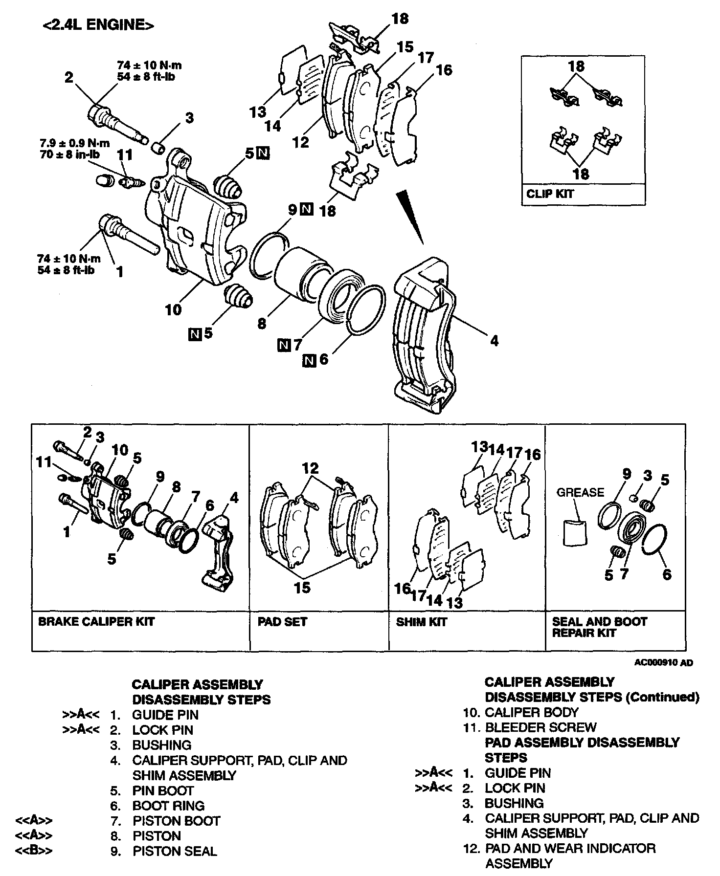 Install the bushing and lock pin to the bleeder nipple side at the caliper body, the guide pin to its opposite side, respectively.