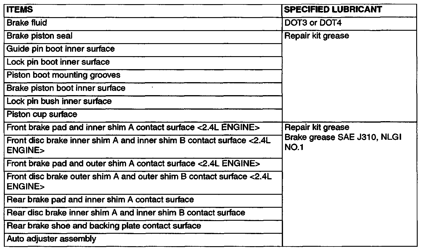 Component Lubricant Specs