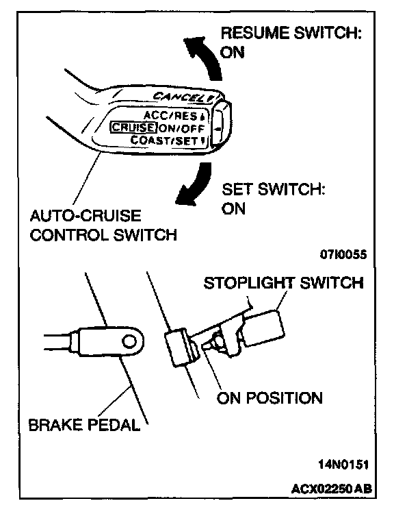 1. Turn the ignition switch to "ON" position while holding the auto-cruise control switch in the "SET" (down) position. Then, within one second, move the cruise control switch up to the "RES" position.