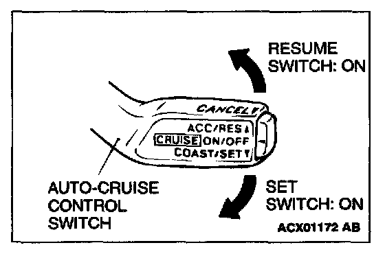 1. Turn the ignition switch to "ON" position while holding the auto-cruise control switch in the "SET" position (down). Then, within one second, move the cruise control switch up to the "RES" position.