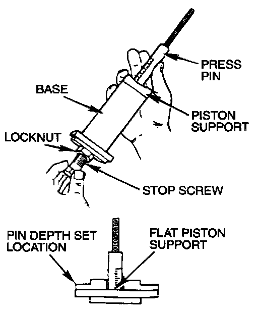 1. Thread the stop screw and lock nut assembly into the base. Fit the correct piston support on top of the base. Insert the press pin, threaded end up, into the hole in the piston support until the press pin touches the stop screw.