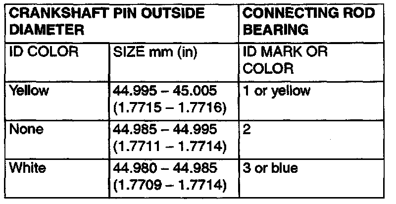 1. Measure the crankshaft pin diameter and confirm its classification from the following table. In the case of a crankshaft supplied as a service part, identification colors/marks of its pins are painted/stamped at the positions.