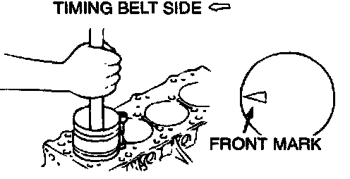 5. Insert the piston and connecting rod assembly into the cylinder with front mark on the piston crown pointing to the timing belt side.