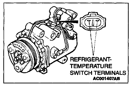 When the A/C is off, check that there is continuity between the refrigerant-temperature switch terminals. If not, replace the switch.