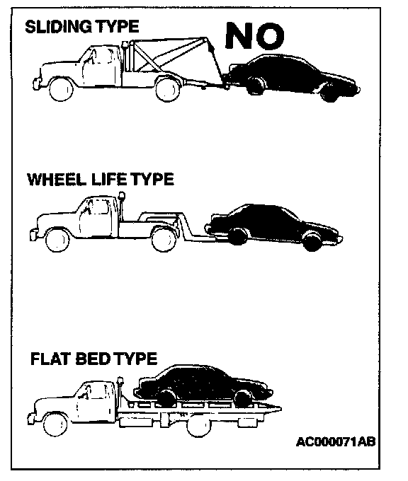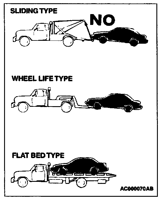 CAUTION: This vehicle cannot be towed by a wrecker using sling-type equipment to prevent the bumper from deformation. If this vehicle is towed, use wheel lift or flat bed equipment.