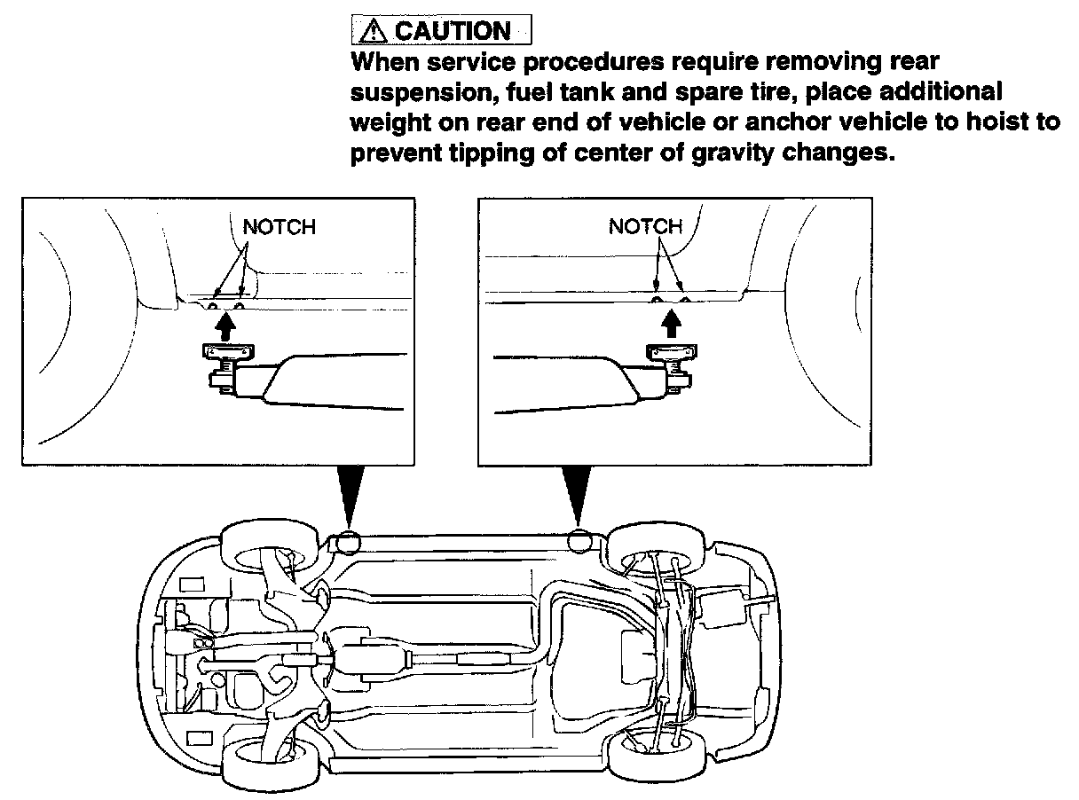Special care should be taken when raising the vehicle on a frame contact type hoist. The hoist must be equipped with the proper adapters in order to support the vehicle at the proper locations.