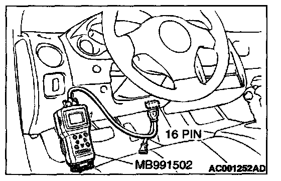 CAUTION: To prevent damage to scan tool MB991502, always turn the ignition switch to the "LOCK" (OFF) position before connecting or disconnecting scan tool MB991502.