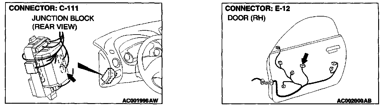 STEP 7. Check the power window relay connector A-04X and power window main switch connector E-12 for damage.