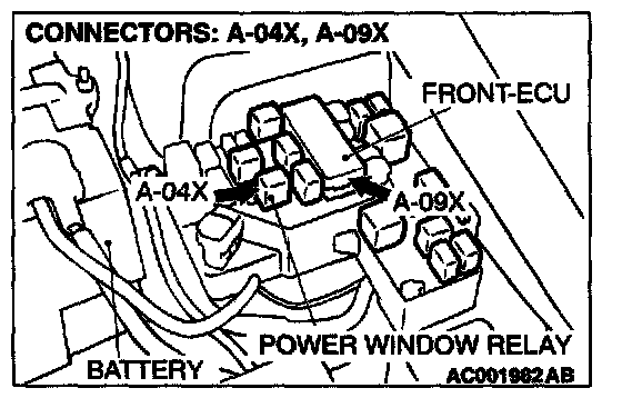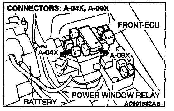 STEP 5. Check the power window relay connector A-04X and front-ECU connector A-09X for damage.