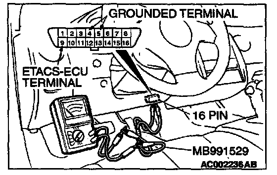 1. Use special tool MB991529 to connect a voltmeter between ground terminal 4 or 5 and ETACS-ECU terminal 9 of the data link connector.