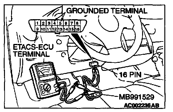 1. Use special tool MB991529 to connect a voltmeter between ground terminal 4 or 5 and ETACS-ECU terminal 9 of the data link connector.
