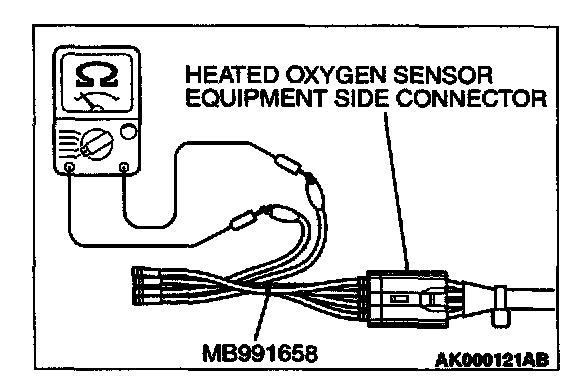 1. Disconnect the heated oxygen sensor connector and connect special tool MB991658 to the connector on the heated oxygen sensor side.
