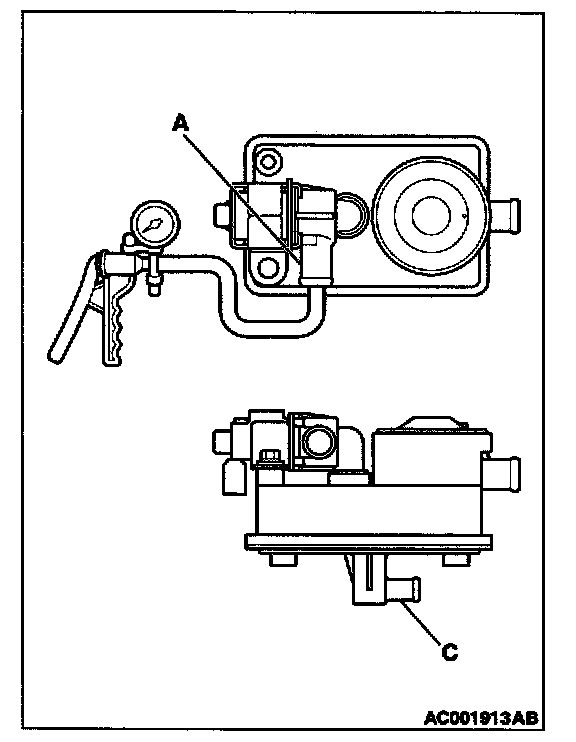 3. With air flow through nipple (C) obstructed, apply a vacuum and check that the vacuum is maintained.