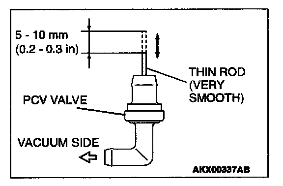 1. Hold the PCV valve with the vacuum side down. Insert a thin rod, and using light pressure, depress the end of the PCV valve spring by 5 - 10 mm (0.2 - 0.3 inch). Release pressure on the rod to see if the PCV valve spring will lift the rod to its original position.