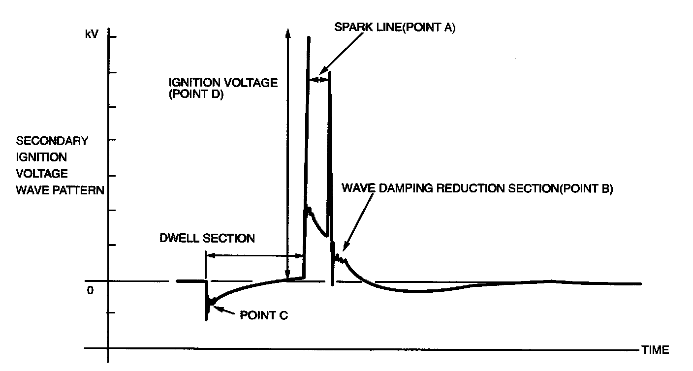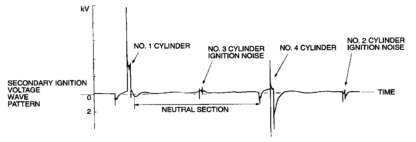 NOTE: Because of the two-cylinder simultaneous ignition system, the waves for two cylinders in each group appear during wave observation. However, wave observation is carried out for the cylinder (Number 1 or 3) with the spark plug cable which has been clamped by the secondary pickup.